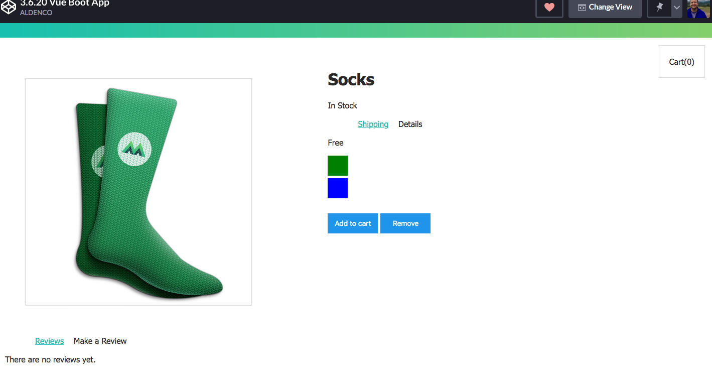 Here, the user can add or subtract items from their cart, view and create product reviews, and display item inventory based on sock color preference.